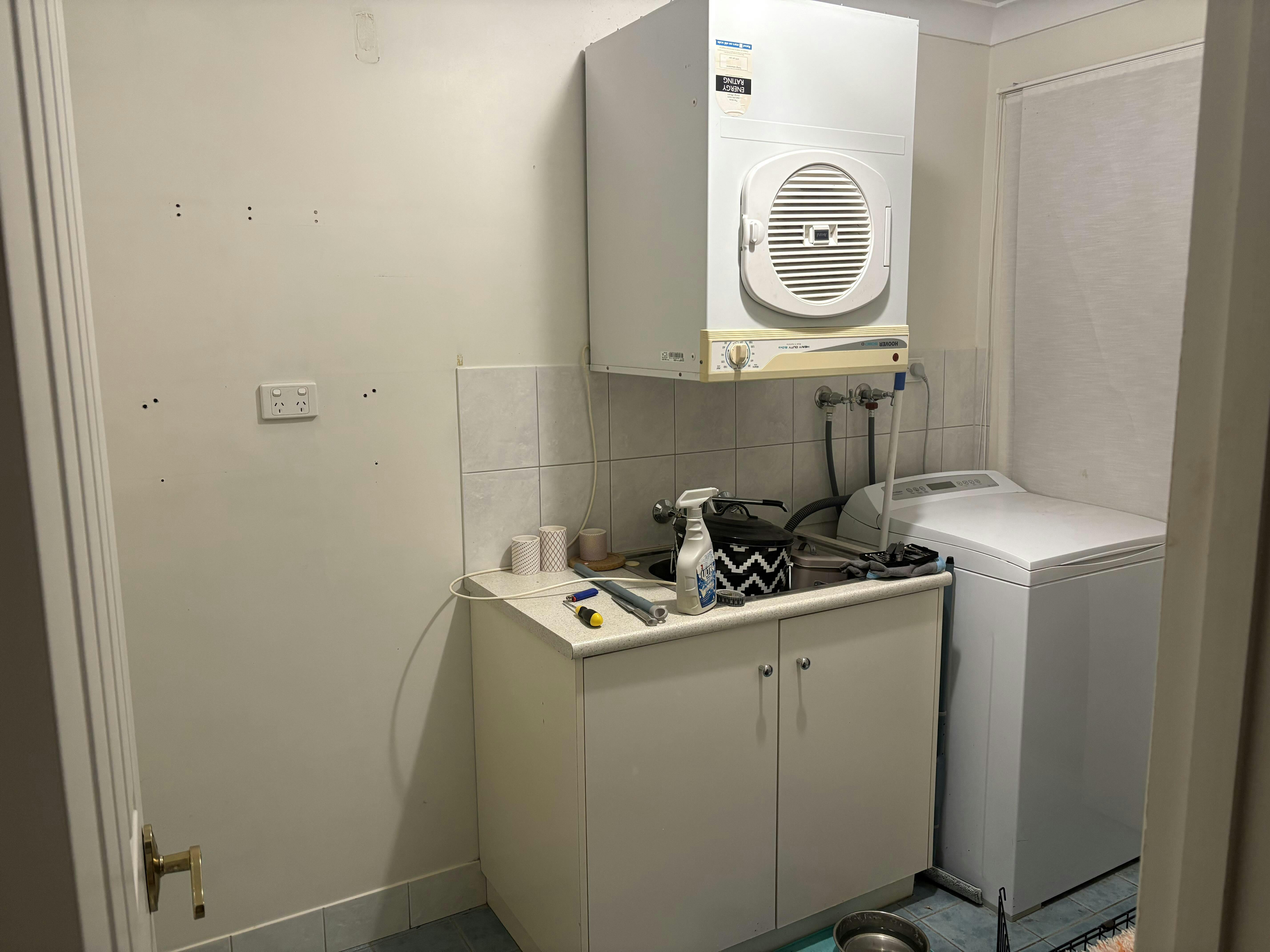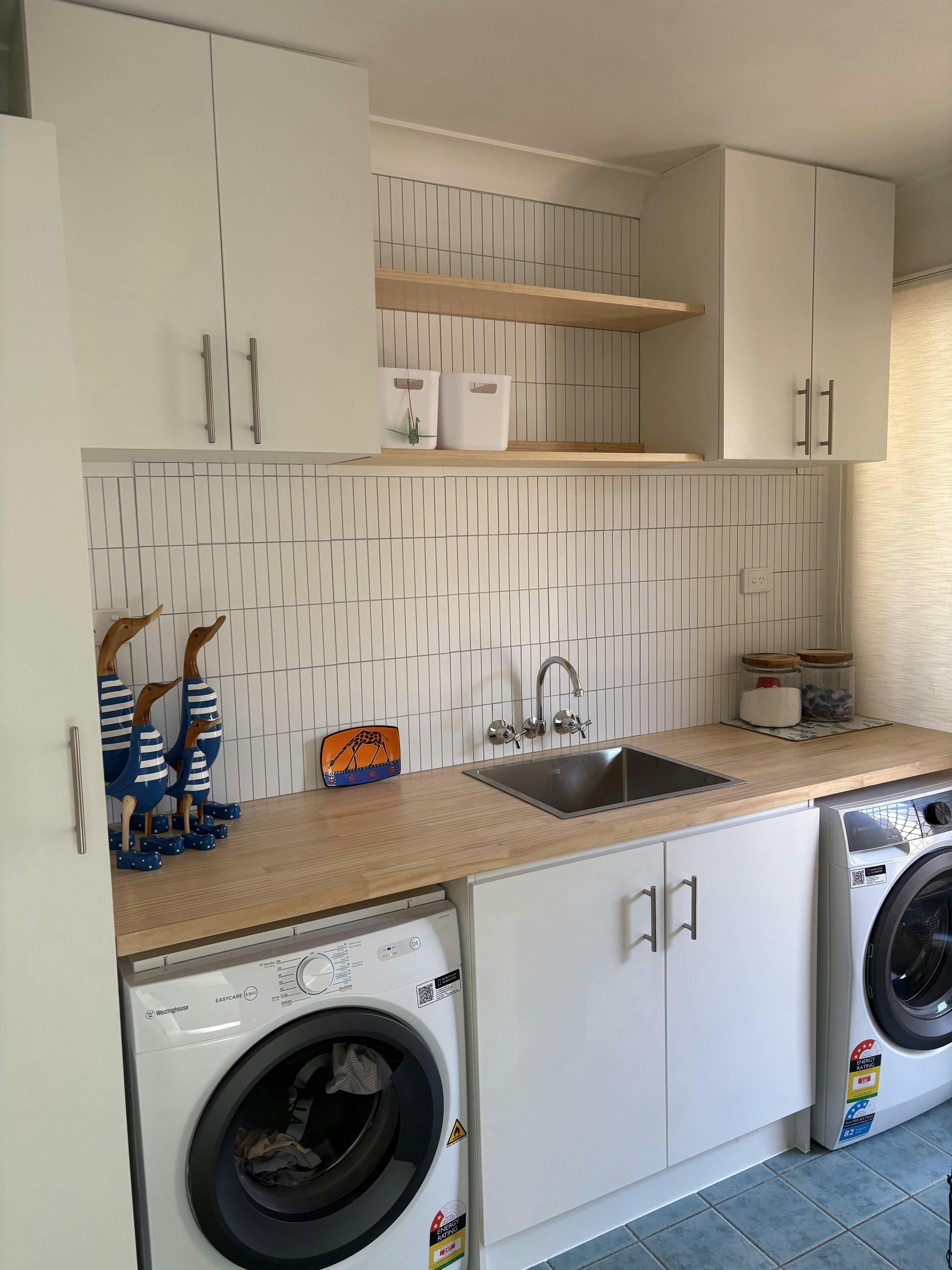 Cutting them took a bit of elbow grease (thanks to awkward shapes around taps and having a blunt utility knife, etc.), but the finish was worth it. I debated between the white and natural stone options, and I’m glad I went with the matte white as it looks perfect in our laundry.